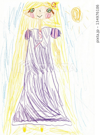 幼稚園児が描いた長い金髪と紫のドレスのプリンセス