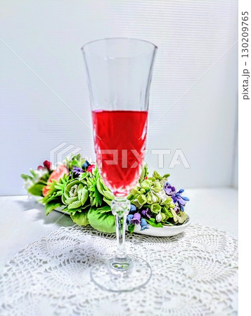 白い背景に赤い液体が入ったオシャレなグラスと花、赤い飲み物は紫蘇ジュース、でもワインやお酒にも見える