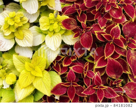 黄緑色と赤色のコリウスの葉をクローズアップした風景
