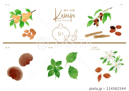 生薬ベクターイラストセット5(杏仁・桑・霊芝・紫蘇・サンシシ)