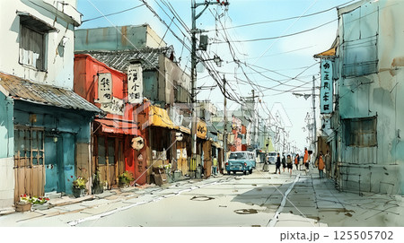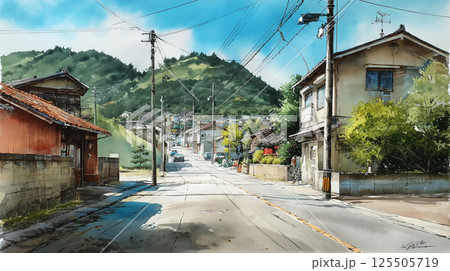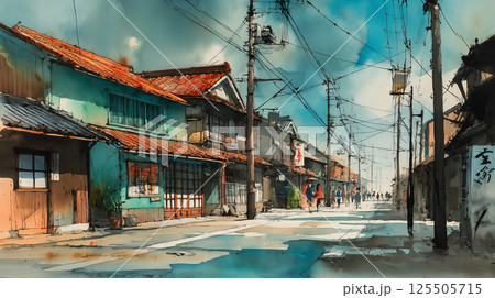 懐かしさを感じる日本の住宅街 木造建築と電線が印象的なレトロな街並みの水彩風手描きイラスト素材