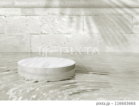 White marble pedestal reflects in water, creating minimalist sophistication and serene calmness