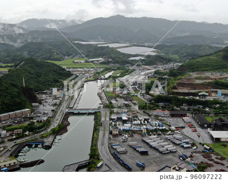 雨上がりの雲に覆われた日向港の港湾の空撮