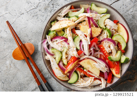 Asian salad with shredded chicken, cucumber, apple, red onion, bell pepper and sesame mustard dressing close-up in a bowl. Horizontal top view