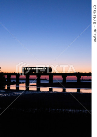 宮崎県日南市細田川河口から広がる日南海岸大堂津海水浴場とJR九州日南線橋梁を走る通勤列車のキハ40