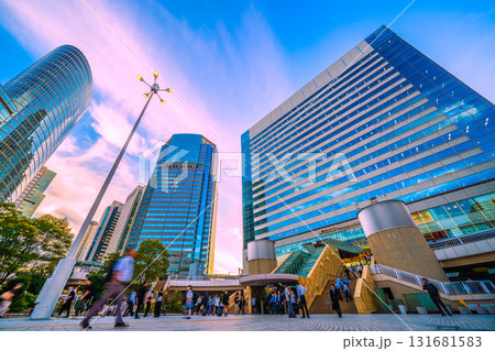 日本の東京都市景観 品川駅前のオフィスビル群や仕事終わりなどのビジネスマンらを望む