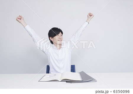 オフィスでバンザイする若いアジア人男性ビジネスマン(解放・解決・達成・終業・成功・合格・嬉しい)