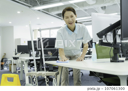 オフィスでデスクを拭き掃除するシニア女性