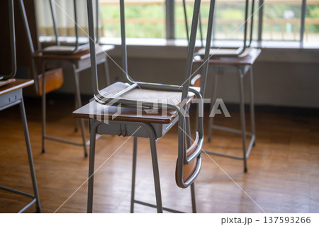 窓辺に片付けられた教室の机と椅子