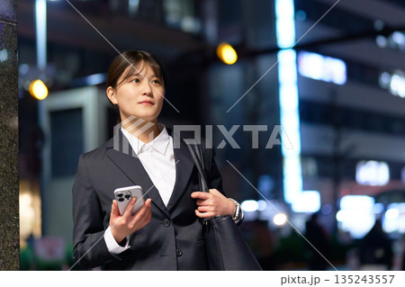 スマホを片手に夜の街に立つ若手ビジネスウーマン