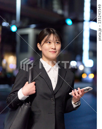 明るい表情で夜の街を歩く若手ビジネスウーマン