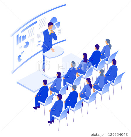 大規模なビジネスセミナーの講演風景イラスト(アイソメトリック)