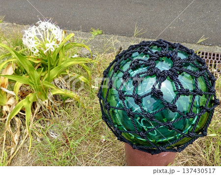 伊勢志摩 ビン玉ロード 絆の灯モニュメントのそばでハマユウが咲く風景 三重県志摩市浜島町
