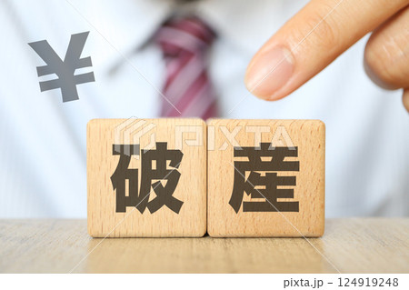 自己破産イメージ。積み木と白背景のコピースペースありの広告素材。