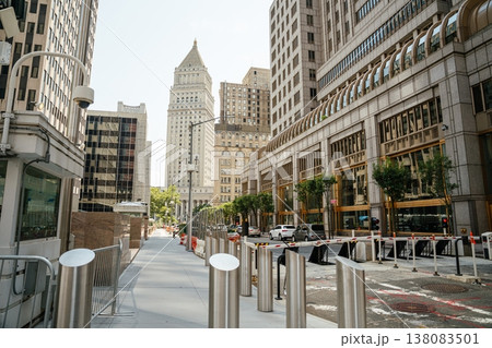 A quiet Manhattan street features a security booth and metal barriers between tall office buildings in New York City. Modern architecture and controlled access infrastructure define the downtown