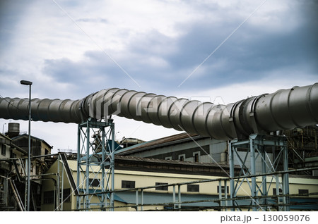 A captivating Winter Industrial Landscape featuring a Frozen River alongside prominent Smoke Stacks