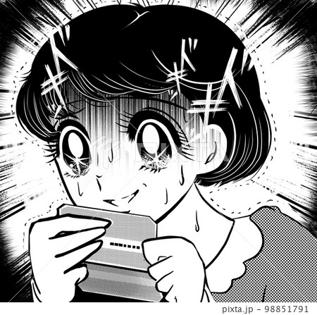 70年代昭和レトロ少女漫画預金残高が給料前でピンチ青ざめる黒髪女性白黒イラストと暗雲背景