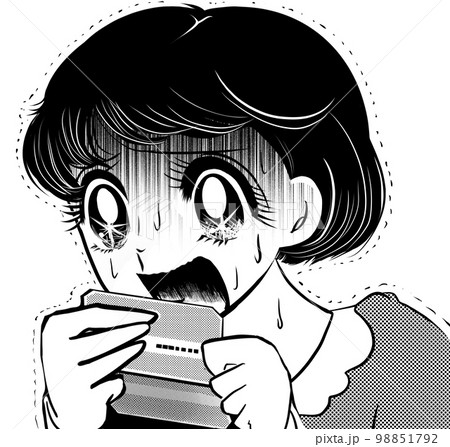 70年代昭和レトロ少女漫画預金残高が給料前でピンチ青ざめる黒髪女性のワイドサイズイラスト