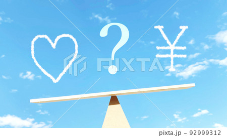 板の天秤の上に座る人形_円マークとハートイラスト入り