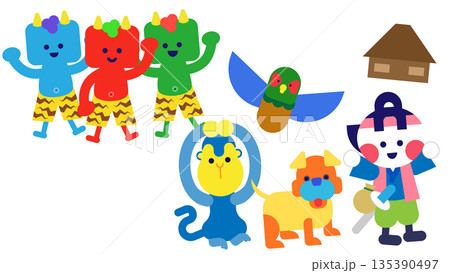 鬼退治を終えて家に帰る桃太郎と仲間たちの日本昔話イラスト