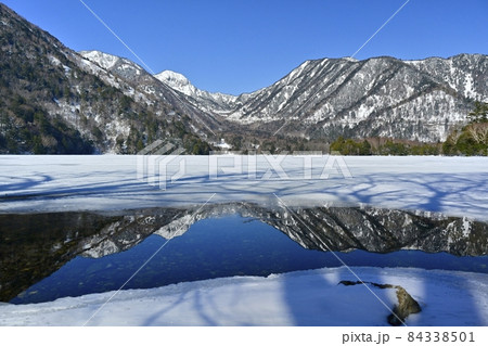 結氷の湯ノ湖に木の影と湖面に映る奥日光の山々