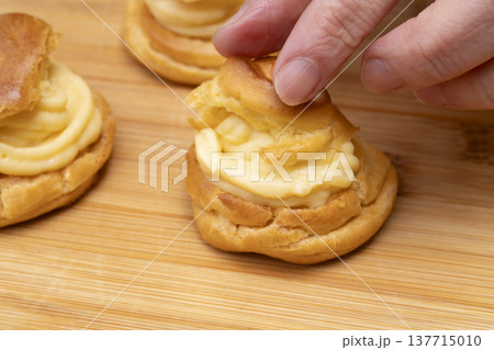 キッチンでシュークリームを作る手元 シュー生地にカスタードクリームを絞り粉糖をふるう