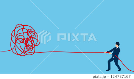 ビジネスの課題と解決 – 絡まった糸を引っ張る男性のイラスト、ベクター