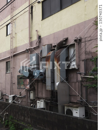 雑多な配管と錆びたダクトがむき出しのビル側面