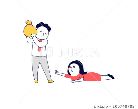 「私のお金を返して!」と泣いてすがりつく女と、お金の入った袋を取り上げる男