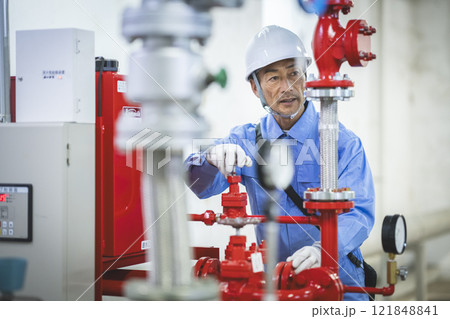 ビルのスプリンクラー設備の点検をするベテランの作業員 ビルメンテナンススタッフ イメージ