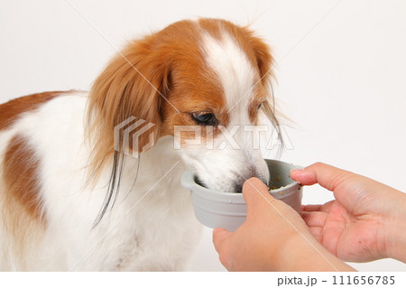 手作りご飯を食べる中型犬コーイケルホンディエ