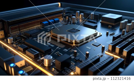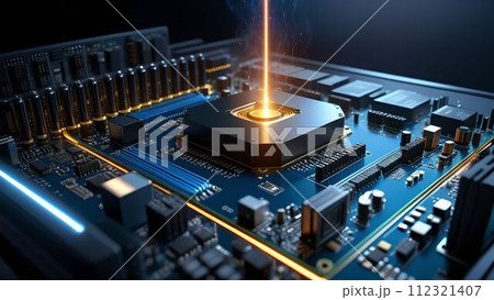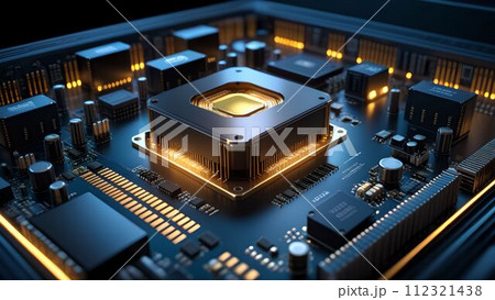 Futuristic Digital Circuit Board with Glowing Lights and Central Processor Chip