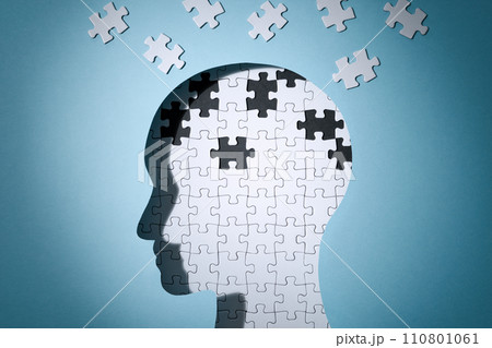 認知症やアルツハイマー病など、記憶を失うイメージ。人の頭のシルエットとピースが欠けたジグソーパズル。