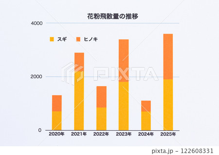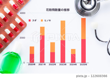 花粉飛散量の推移グラフと聴診器と薬と目薬