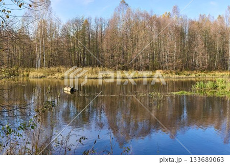 Beautiful lake and rocky shore in the rays of evening sun of golden autumn in cloudy weather