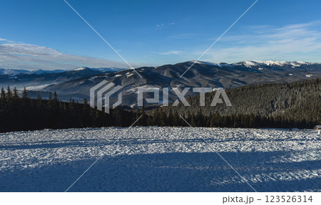 Snowy mountains and blue sky in Polyanytsia, Ukraine, Jan 18, 2025