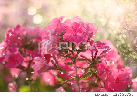 Abstract floral background.Summer rain in the garden and flowers with drops and bokeh, blurred focus. Beautiful summer garden in the early morning with natural bokeh and rain, summer postcard
