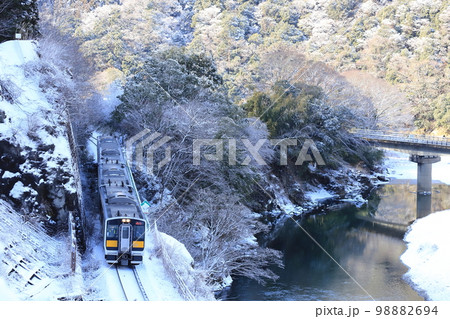 水郡線「雪化粧した山間部と久慈川沿いを走る列車」