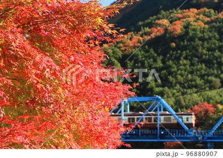 わたらせ渓谷鐵道「楓の紅葉と青い鉄橋を走る列車を背景に」