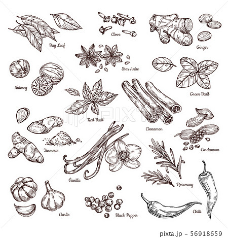 Hand drawn spices. Vanilla and pepper, cinnamon and garlic. Sketch kitchen herbs isolated vector set