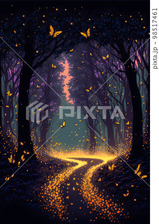 蛍や鳥が舞う素敵な魔法の森「AI生成画像」