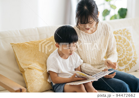 育児を楽しむ母親と息子のセット 読み聞かせ 寝かしつけ