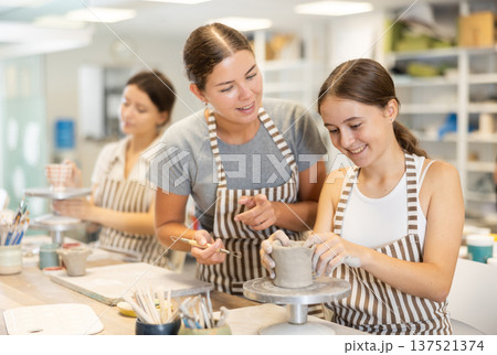 During master class, teen girl student sculpt from clay under guidance of female teacher.