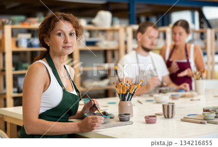 During workshop at master class, female employee paints clay vessel plate