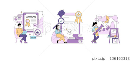 Vector illustrations showcasing educational achievements and creativity. Includes individuals celebrating certificates, excellence, and expressive art. Ideal for concepts of learning, motivation, and