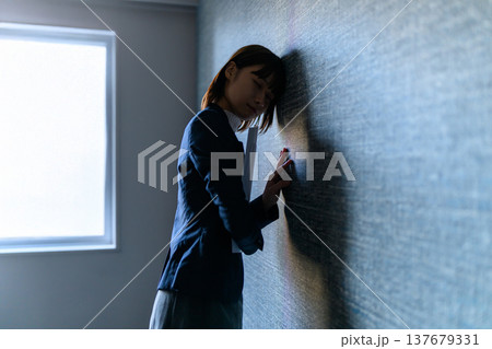 スーツ姿の女性が壁に寄りかかり悩んでいる (シネマティックフォト)