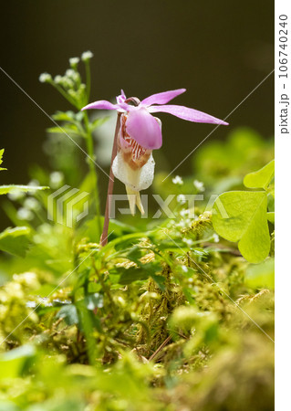 亜高山の苔上で木漏れ日に輝くホテイラン