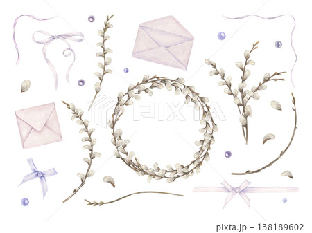 Willow branches, envelopes, ribbons, tied bows and beads clip art watercolor illustration on isolated background. Easter accessories set for greeting cards, invitations, spring packaging