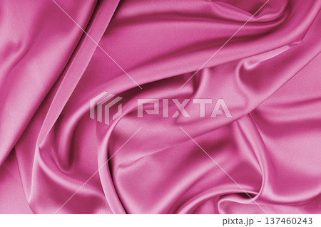 Crumpled, wrinkled pink colored glossy silk satin texture. Shiny fabric cloth with wave folds