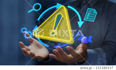 リスクマネジメントと評価のフィードバックサイクル。分析とモニタリングのプロセス。黄色い三角形の警告ア
